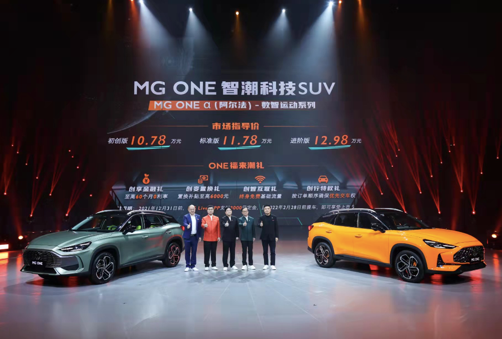 2021年12月02 15:58 来源:蜀锦传媒12月2日,MG旗下首款“智潮科技SUV”MG ONE上市。此次上市的车型为数智运动系列MG ONE-α,共有3个版本供用户选择,且起步就是豪华高配,初创版10.78万元;标准版11.78万元;进阶版12.98万元。2021年12月31日前,用户在MG Live APP支付3000元定金,且2022年2月28日前提车,即可享有ONE福来潮礼——四大上市权益:一是创智互联礼,终身免费基础流量;二是创变置换礼,置换补贴至高6000元;三是创享金融礼,至高可享60个月0利率;四是创行特权礼,按照订单顺序确保优先交车权。科技时尚系列MG ONE-β持续盲定中,并计划于2022年上市。