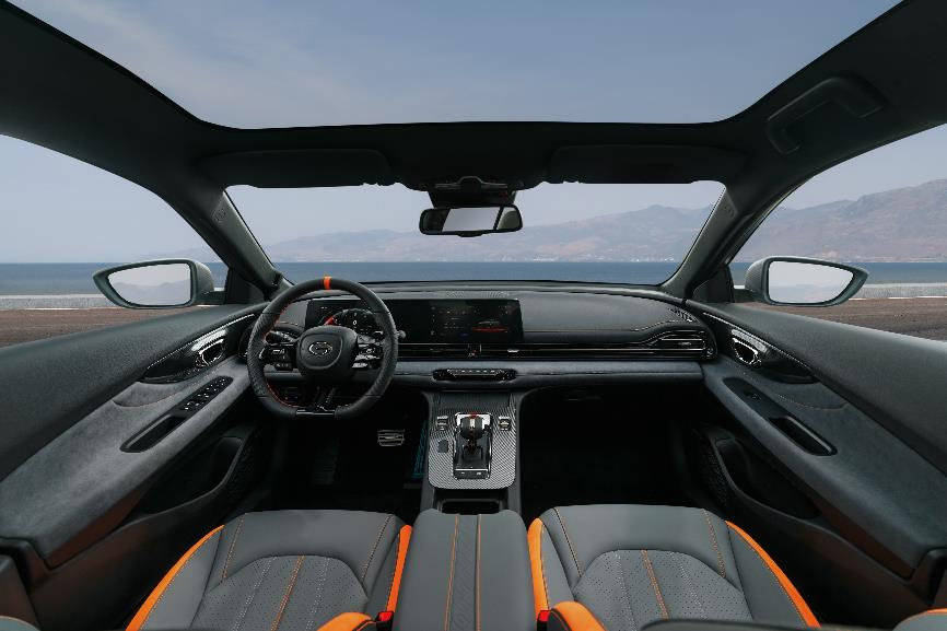 内饰大面积超纤麂皮的使用,满足赛道轻量化需求,高级触感演绎豪华;灰橙撞色设计,为强烈的运动驾驶氛围锦上添花,坐在车内即感受赛道激情。