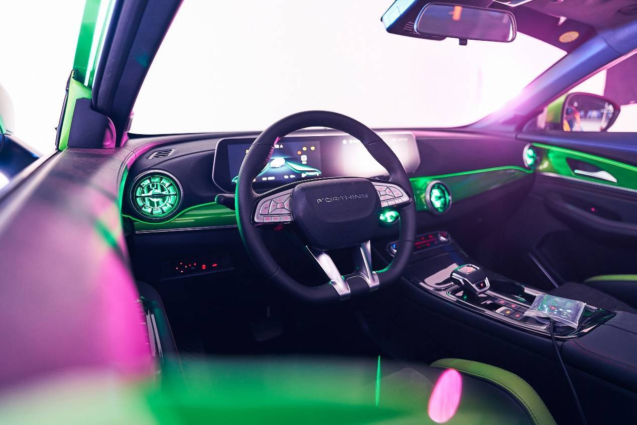 内饰中,风行T5 EVO敞篷版则是将外观的绿色延续到内饰,达到内外呼应的效果。前排两个座椅用了赛车座椅的凳架,在里面做了大量的填充,不仅有型坐着还很舒服。在其它细节方面,空调出风口加入了氛围灯光、车顶带有3D打印的镂空标识同样加入氛围灯光的点缀,在点亮之际,瞬间将整个座舱格调的运动氛围拉满。