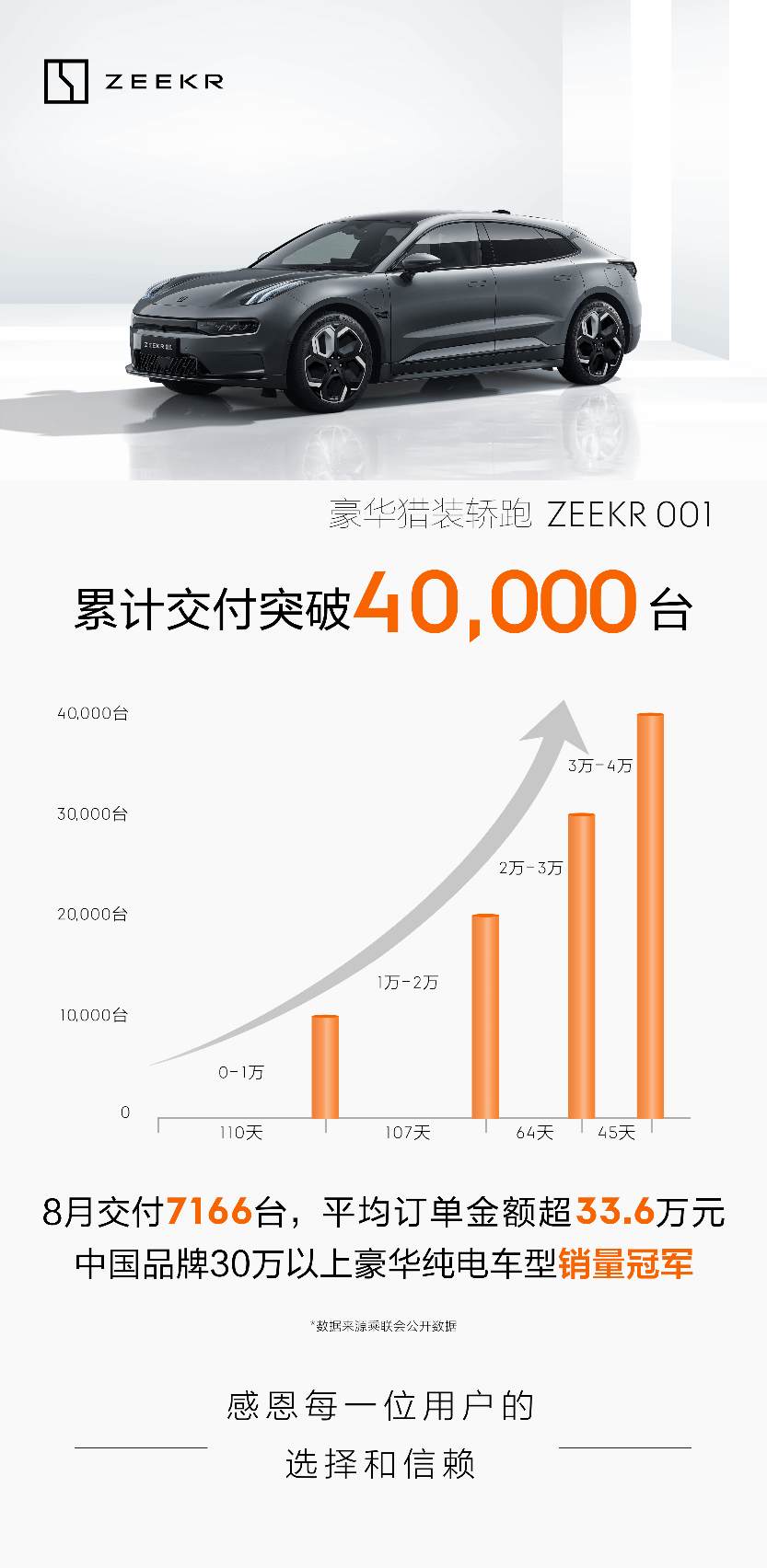2022年09月14 16:44 来源:蜀锦传媒今日,极氪智能科技宣布:旗下豪华猎装轿跑极氪001累计交付量突破4万台,这代表着极氪又一里程碑的达成。同时,根据公开数据,极氪001成为8月中国品牌30万以上豪华纯电车型销量冠军。