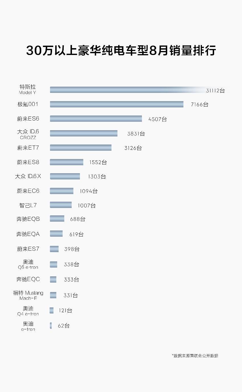 8月极氪001交付7166台,环比增长42.7%,更是成为中国品牌30万以上纯电车型交付量第一。同月,极氪001的大定订单(5000元不可退定金)再次破万,平均订单金额超过33.6万元,持续刷新中国豪华纯电品牌价值新高度。