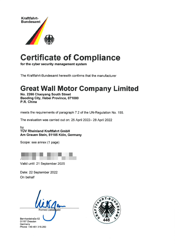 2022年10月12 11:02 来源:蜀锦传媒近日,长城汽车股份有限公司(以下简称“长城汽车”)成功获得德国联邦机动车交通管理局(KBA)颁发的UN R155(联合国欧洲经济委员会第155号法规)车辆网络安全管理体系(Cybersecurity Management System, CSMS)符合性证书,成为国内首家获得德国KBA颁发此项认证的公司。