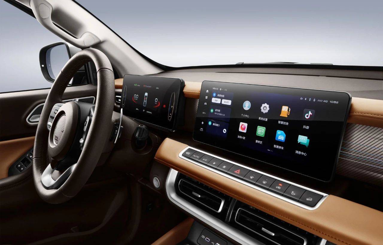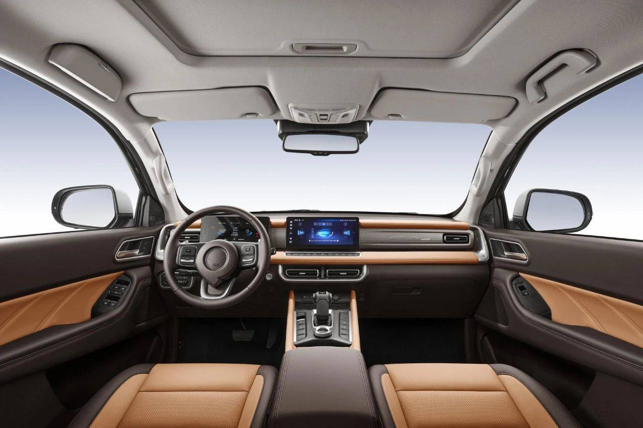 豪华科技新体验。2023款乘用炮采用全新精致科技风内饰,大面积软质包覆、7英寸彩色液晶仪表+12.3英寸智联触控屏双悬浮设计、镭雕工艺发光装饰板,科技感爆棚。此外,仪表板左右增加大储物盒,增加储物空间,同级领先。