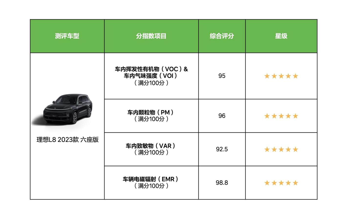 2023年04月27 14:49 来源:蜀锦传媒2023年4月27日,中国汽车工程研究院股份有限公司及国际交通医学会主导的中国汽车健康指数发布最新一批评级,理想L8获得四项测试全五星认证(车内挥发性有机物和车内气味强度、车内颗粒物、车内致敏物、车辆电磁辐射全五星)。