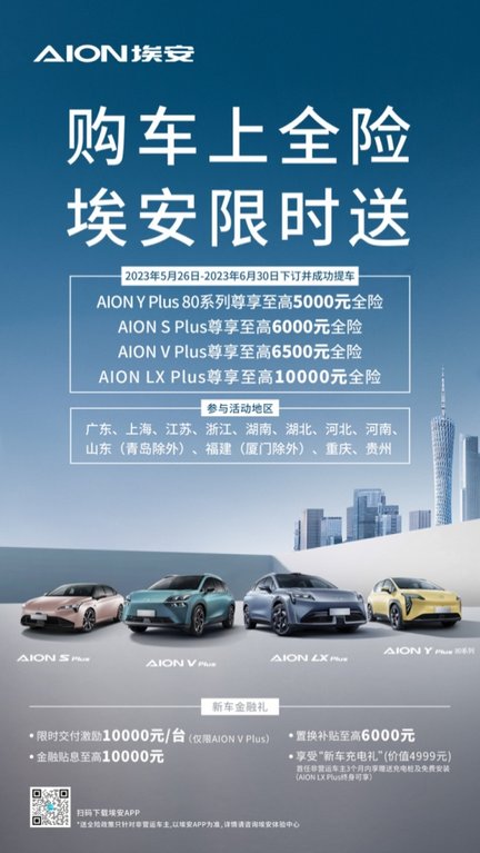 据悉,三种主题的夏日潮玩精品都将在埃安APP出售。另外,埃安还在重庆等全国12个省份和直辖市,推出了“购车上全险,埃安限时送”活动,凡活动期间(5月26日至6月30日)购买AION系列,下订并提车的用户,最高可获10000元全险。同时还可享受新车金融大礼,包括10000元/台的限时交付好礼(仅限AION V Plus)、至高6000元的置换补贴、至高10000元的金融贴息,以及新车充电礼等。