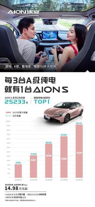 此次发布会的“两大主角”,AION Y Plus和AION S Plus的市场表现尤为亮眼。今年5月AION Y Plus热销达19306台,同比增长133%,销量与特斯拉Model Y并驾齐驱,纯电SUV市场迈入“YY时代;AION S Plus则是纯电A级轿车中的No.1,五月销量达到25233台;从2023年1月到4月上险量看, AION S系列在纯电A级轿车市占率超过34%,即,每3台A级纯电,就有1台AION S。