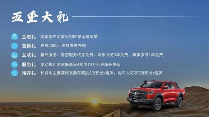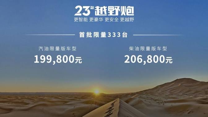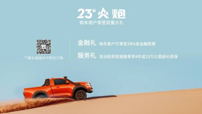 2023款越野炮增配不加价,汽油车型官方指导价16.98万元-17.98万元,柴油车型官方指导价17.68万元-18.68万元;同时,感恩新老用户的支持与厚爱,越野炮上市3周年,特别推出23款越野炮限量版,首批333台,汽油限量版车型售价19.98万元、柴油限量版车型售价20.68万元。购车用户尊享“金融礼、置换礼、互联礼、服务礼、推荐礼”五重大礼,333台限量版用户还额外享受价值3000元的户外露营礼包。2023款火炮官方指导价18.28万元,通过长城炮APP即可订购,尊享金融礼、服务礼。