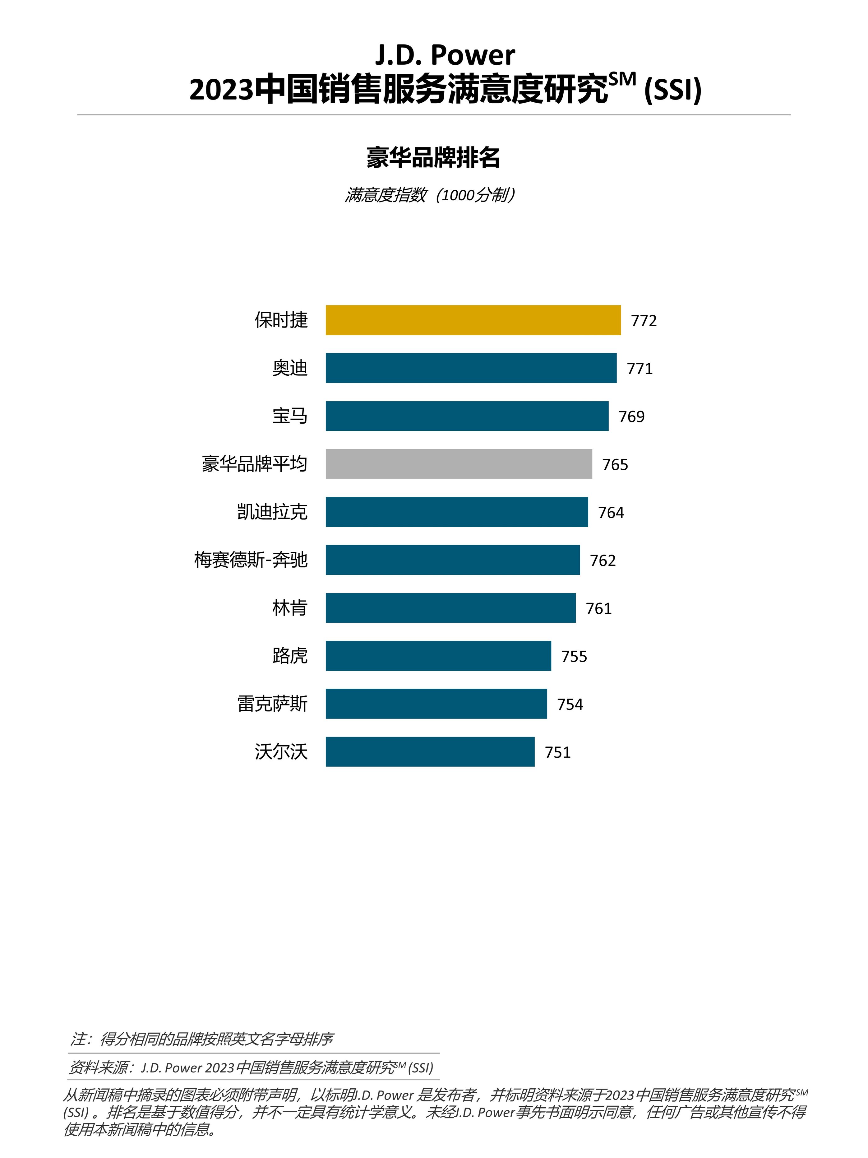 保时捷以772分蝉联豪华品牌销售服务满意度冠军。 奥迪(771分)排名第二,宝马(769分)排名第三。