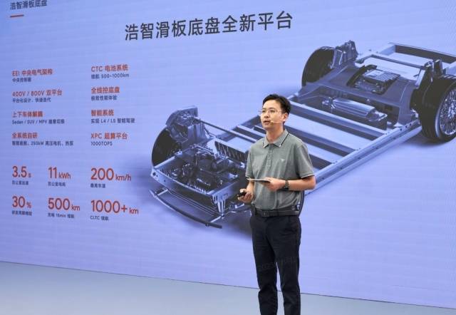此次发布的第二款技术产品为浩智滑板底盘。它作为全球性平台架构,能够适用多种车型,具有高集成、高效率、高续航、高倍率等优势,并通过上下车体和软硬件解耦开发,让生产效率提升20倍,生产场地缩减50%,研发周期缩短30%,进而降本增效。此外,它还通过搭载浩智超算平台、交流异步和永磁同步SiC电驱、CTC技术,并通过一体化压铸工艺和铝合金型材能量舱结合的设计,将电池能量舱与车身结构结合为一体,实现了更强的通用性、更大的载电量、纳米级的安装精度和更高的刚度,汽车性能、可靠性、生产效率、场地利用率等都大幅提高,也实现了对智能驾驶的赋能。
