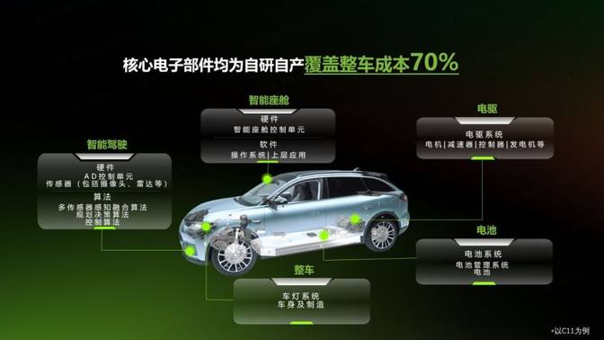 零跑汽车已经实现整车成本70%的自研自造能力,围绕智能动力、智能驾驶、智能座舱核心技术进行持续研发和创新,形成了全域自研、垂直整合的护城河。零跑汽车董事长朱江明曾表示正是在全域自研技术的加持下,零跑才能快速打出“增程+纯电”的组合拳。