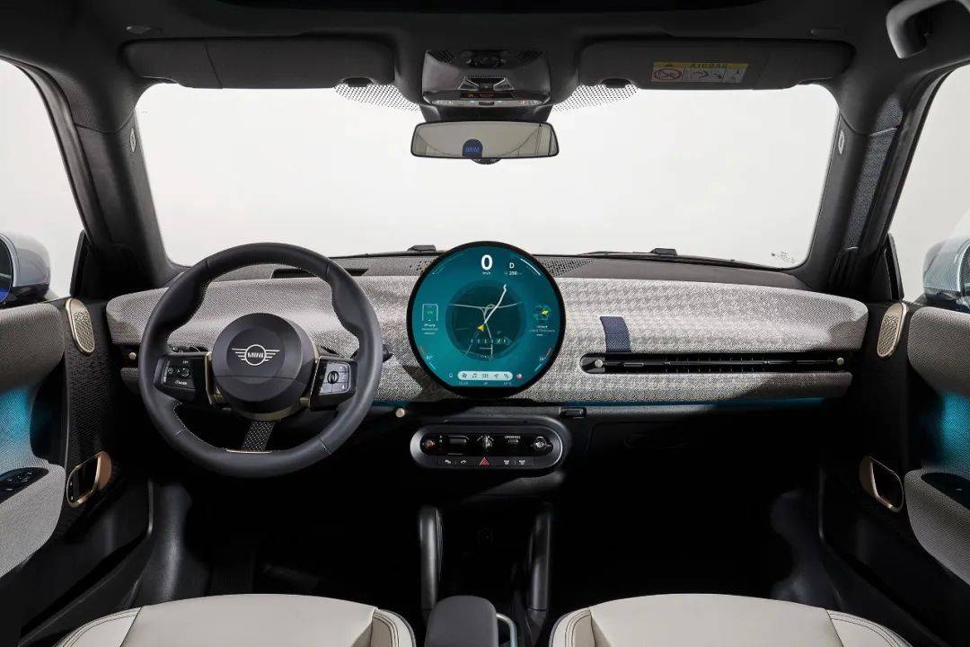 前排区域设计完美致敬经典Mini当年的大胆和简约造型,仅保留三个基本元素——方向盘、圆形中央显示屏和拨杆开关,构成了车内最纯粹的设计,生动诠释着MINI至简的特质。