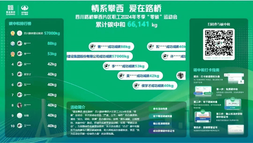 值得一提是,本次活动还通过“点点”平台赠碳功能,向每一位参与者赠送20公斤碳信用,用于抵消个人参加本次活动过程中产生的碳排放。四川环交所为活动定制碳中和打卡大屏,实时展示碳中和证书,增强了活动的透明度和互动性,吸引参与碳中和人数达500余人,实现了绿色低碳理念的有效宣传。