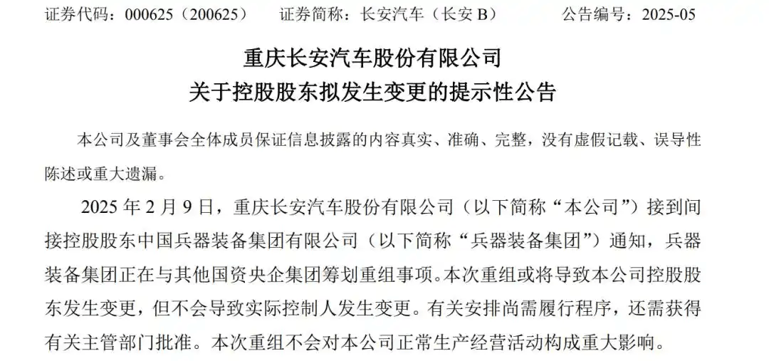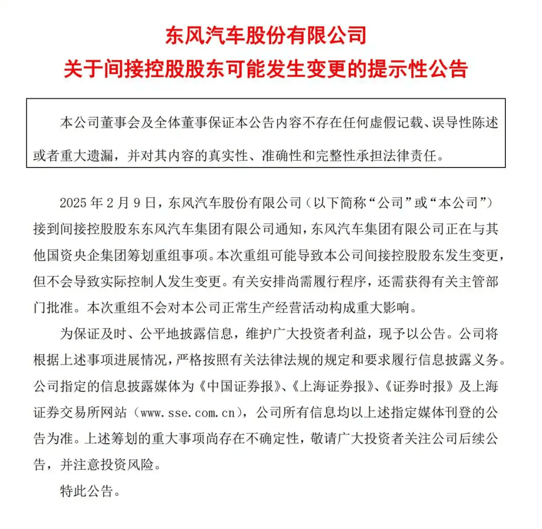 ③从目前的公告来看,只说重组停留在控股集团层面,不影响长安汽车和东风汽车的日常经营,那这次重组的具体细节还有待进一步的消息,以后长安和东风的产品是否会技术共享?是否有新的品牌诞生?是否会共享经销商渠道?这些问题皆需时间给出答案。理论上说,这不可能只是一次简单的重组,而是长安和东风两大央企的重构,我们可以共同期待后续。也许2025年开年的这一场大戏,只是整个中国汽车行业大变革的开端,还远远未到尾声。