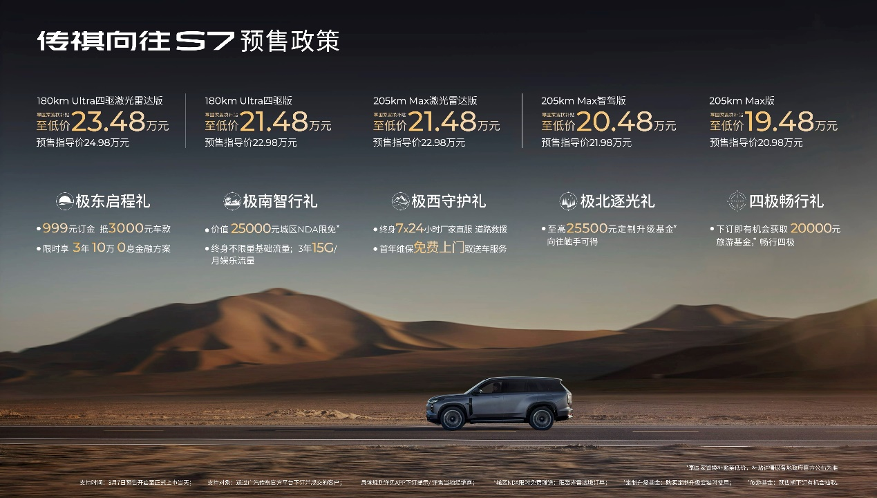 发布会上,作为压轴环节,传祺向往S7正式揭晓了其预售价格,涵盖两大系列共五大车型版本,价格区间为20.98万至24.98万元,享受国家补贴后低至19.48万至23.48万元,意味着仅需不到20万元,就能轻松拥有传祺向往S7。预售期间,传祺向往S7还推出了五重超级预售权益,登录广汽传祺APP即可抢先预订,早订早享受。