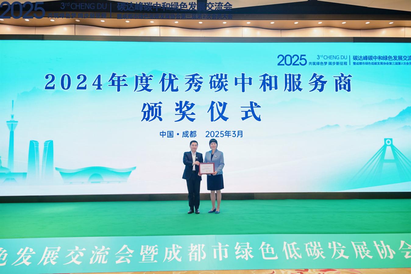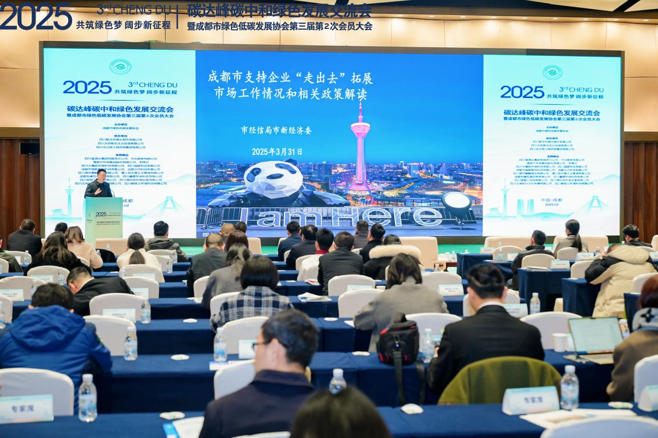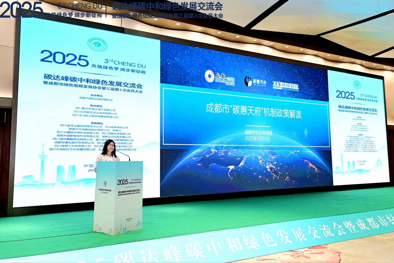 2025年04月01 14:28 来源:蜀锦传媒3月31日,以“共筑绿色梦,阔步新征程”为主题的2025碳达峰碳中和绿色发展交流会在成都天府国际会议中心隆重举行,同步召开成都市绿色低碳发展协会第三届第2次会员大会。