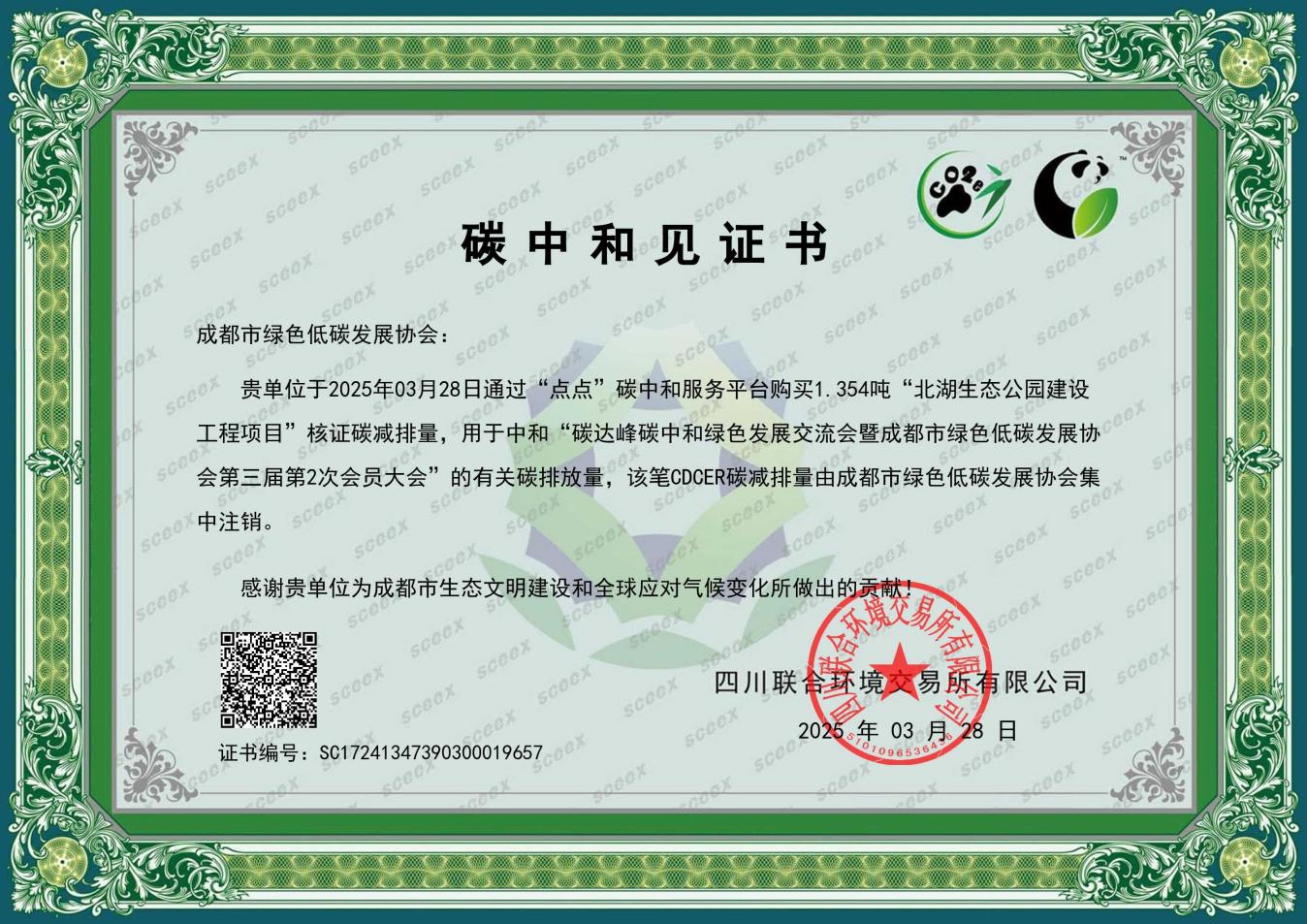 值得注意的是,本次会议秉承绿色低碳理念,依据《成都市会展活动碳足迹核算与碳中和实施指南》(DB5101T41-2018FDIS)开展核算和碳中和工作,通过优先采购碳中和产品和低碳产品,推行电子化会务材料、运用“点点”碳中和服务平台购买核证碳减排量等举措,实现了全流程“零碳”办会目标,获颁“碳中和见证书”。
