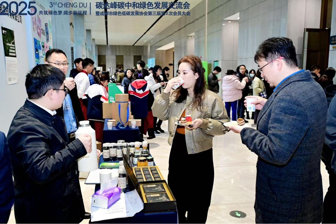 此外,会议现场设置的“双碳”主题集市集中展示了碳中和产品及低碳环保设备,特别是协会主导开发的全国首款“碳中和”火锅底料、蒲江雀舌茶叶及西部首款“碳中和”草莓等创新成果。这些产品的开发不仅落实了市政府“零碳券”补贴政策,还通过生态振兴助力乡村振兴,为促进企业绿色转型提供了创新范例。