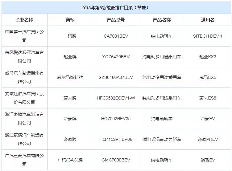 8月2日,工信部发布了第8批《新能源汽车推广应用推荐车型目录》,共有385款车型进入,其中乘用车部分共51款新车型,包括纯电动乘用车47款,插电式混动乘用车4款,东风、一汽、比亚迪、吉利等车企都有多款车型进入。部分车型信息见下表: