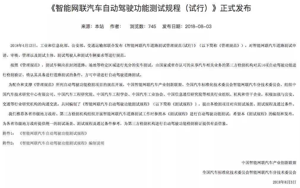 8月3日,全国汽标委等发布了《智能网联汽车自动驾驶功能测试规程(试行)》(简称“测试规程”),为智能网联汽车自动驾驶功能检测提供了相应的测试场景、测试规程和通过条件,适用于申请进行智能网联汽车道路测试的乘用车、商用车辆。