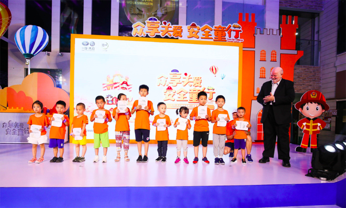 嘉宾与安全小卫士代表共同启动一汽-大众服务品牌儿童爱车堡夏令营