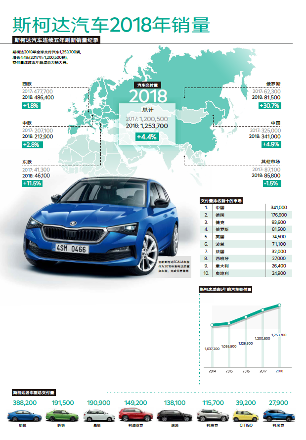 2018年,斯柯达在其全球最大单一市场中国终端交付汽车341,000辆,增长4.9%(2017年:325,000辆)。