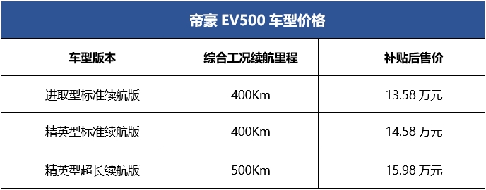 在用车成本方面,以帝豪EV500精英型超长续航版为例,其综合工况下百公里电耗低至13 kW·h,达到同级最佳的水准,按照北京居民用电价格,每公里电费低至7分钱,极大地降低了运营成本。