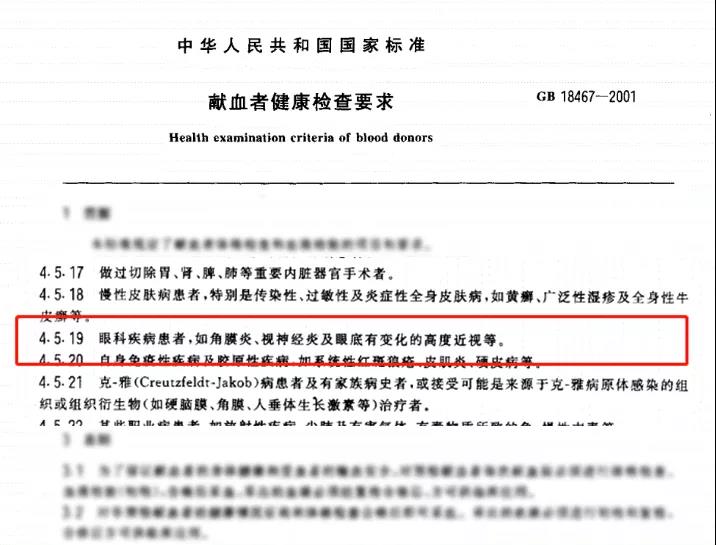 任何观点都要摆事实讲道理。查阅官方资料可以看到,国家标准GB18467—2001版提到眼科疾病患者,如角膜炎、虹膜炎、视神经炎和眼底有变化的高度近视不能献血,而在国家标准GB18467—2011版里中这一条已经不见踪影。