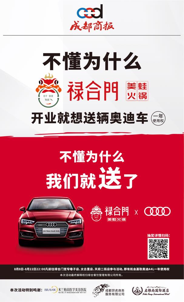 禄合门美蛙火锅这次抽奥迪车的活动确实在成都引起了不小的反响,老板都是80后,分工明确,有负责菜品研发的,有负责公司运营团队管理的,有负责品牌营销的。