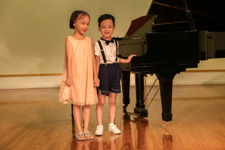 两位6岁的小朋友尹湘媛和田洪宇合作了一首四手联弹《小宝宝要睡了》