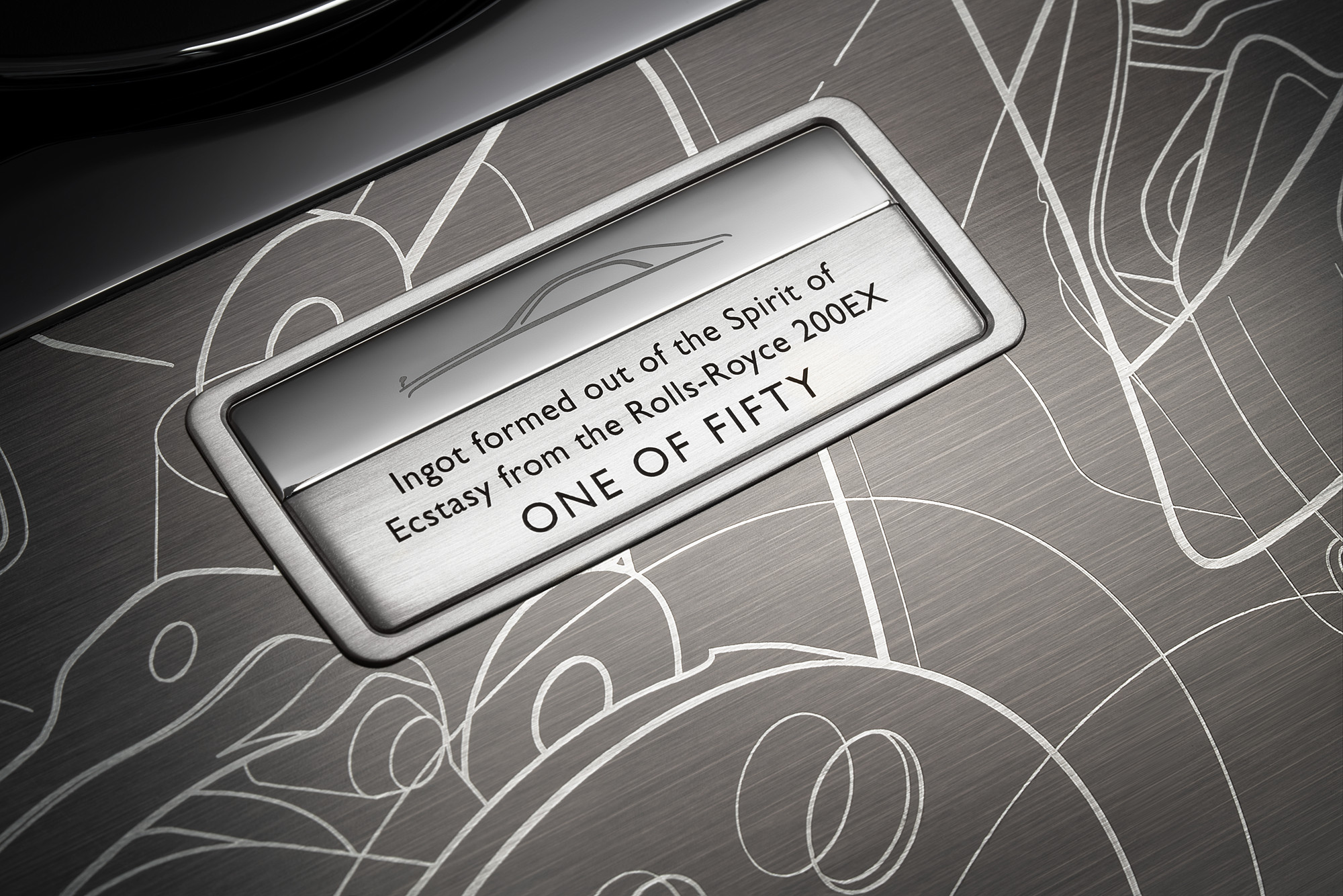 劳斯莱斯200EX,展现了兼顾驾驶者及乘客的双中心理念。古思特至臻典藏版借鉴了200EX的设计,而且劳斯莱斯将200EX车型上的原版欢庆女神雕像打造成纪念铸锭融嵌在这50台限量车型的中控台上。饰板处刻有三条古思特核心设计线条,详尽展示了该车型的关键性特征。古思特至臻典藏版的欢庆女神雕像及时钟上则刻有这款重要车型的英文名字。