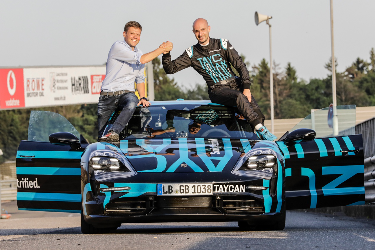 Taycan原型车创下纽北新纪录后,Taycan产品线副总裁史蒂芬·维克巴赫与保时捷测试车手拉尔斯·克恩在车上合影