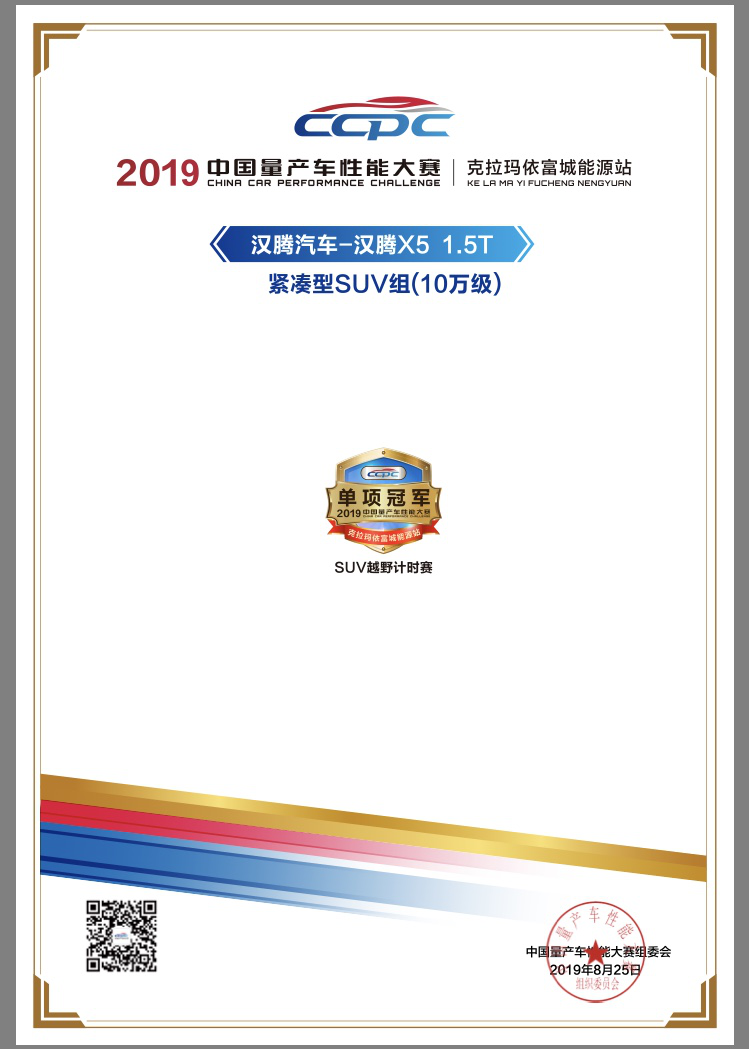 2019年08月30 17:05 来源:蜀锦传媒8月25日,2019中国量产车性能大赛(2019CCPC)新疆克拉玛依站完满落幕,汉腾X5在首站赛事中力压全场33款车型,其中不乏豪华品牌及合资品牌,以全场第一的优异成绩,斩获“SUV越野计时赛”冠军大奖,赢得“开门红”,以品质当道,上演王者归来!