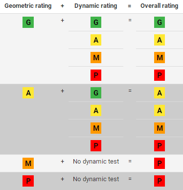 动态测试的评分标准由两部分组成,一是座椅设计参数,二是假人响应。座椅设计参数包括头枕接触时间(受到撞击后必须小于等于70毫秒)和躯干加速度(必须小于等于9.5 g)。假人响应速度包括在测试过程中在假人上测得的最大颈部剪切力和最大颈部张力。这些颈部力(分为低,中或高)可以验证在向后碰撞中,乘员头部和颈部受到的支撑程度到底如何。