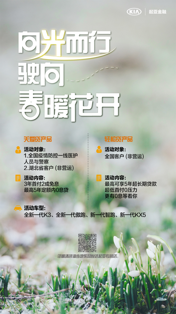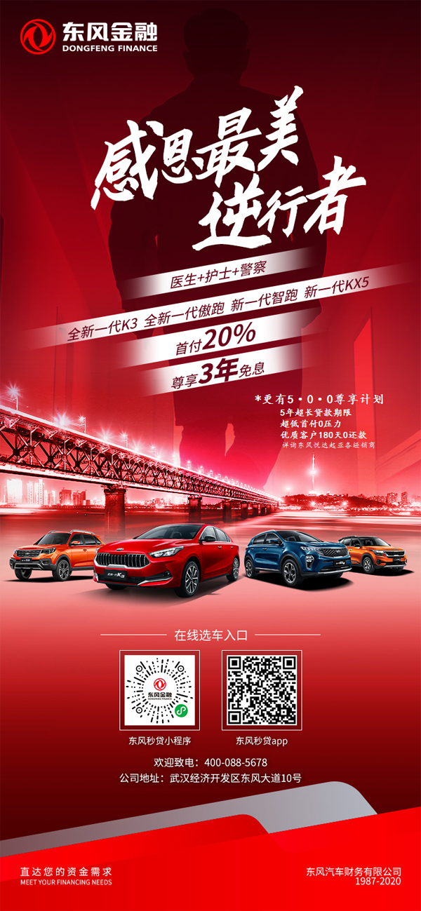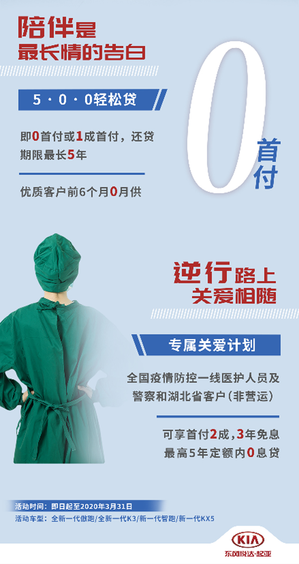 为了向奋战在全国抗疫一线的医务、警务工作者致敬及对疫区用户的关爱,东风悦达起亚还特别推出了针对医生、护士、警察人群和湖北客户的专项金融政策,在现有全国用户金融政策的基础上可额外享“首付20%、3年免息”的购车优惠,为爱驰援、共克时艰。