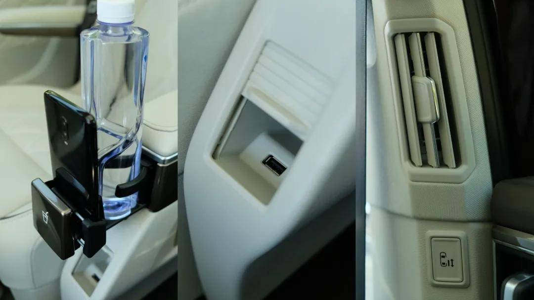 另外,在第二排两张座椅的固定扶手上,威然还有小心思。一个可弹出式的杯架看起来不起眼,但实际上是两个储物格,在放杯子的前端还有一个手机夹槽,此前未曾见过类似的设计,很有意思。
