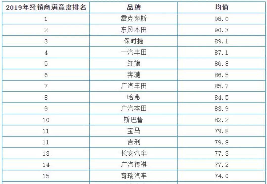 汽车经销商最看好哪些品牌?5月27日,中华全国工商业联合会汽车经销商商会公布了2019年汽车经销商对厂家满意度榜单,雷克萨斯夺得总榜第一。商会连续第5年公布该榜单,调研对象面向全国4S店。评分包括8项维度,其中“投资回报”和“品牌与产品”权重最高,分别为40%和20%。调研结果,很大程度上能反映品牌盈利能力和市场认可度。