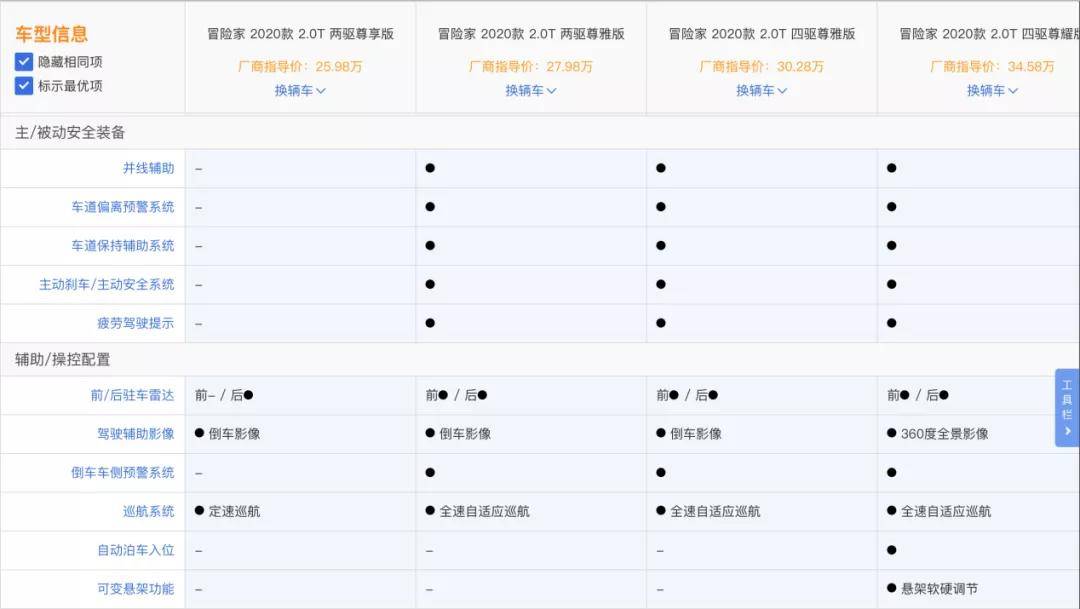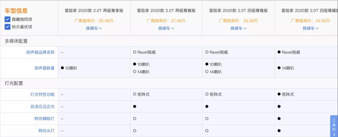 如果选择两驱车型,推荐尊享版,相比尊雅版少的也就是自适应巡航;至于选择四驱版的用户,选择四驱的低配就够了,大不了选装一个音响。至于最顶配版虽然各项配置都让人很爽,但是相比于此顶配车型贵出了四万多元。