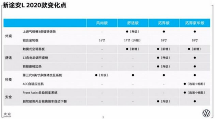 日前,我们从相关渠道获得了大众新款途安L的配置信息。新车与现款车型基本保持一致,仅在配置方面进行了升级。据悉,新款途安L有望于7月底前正式上市。外观方面来看,舒适版车型前脸进气格栅升级了三横幅式镀铬饰条。在配置上,风尚版车型增加了8英寸中控屏;舒适版车型升级了17英寸轮圈和触控式空调面板;拓界版升级了触控式空调面板、12向电动座椅调节、前排座椅加热以及副驾驶外后视镜倒车自动下翻功能;拓界豪华版车型标配了ACC自适应巡航和主动刹车两项配置,同时新增了触控式空调面板。
