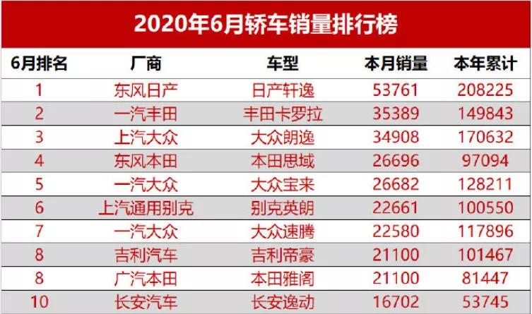 与中国品牌在SUV领域的热火朝天相比,轿车领域又是完全不同的一番景象,甚至一线主流中国品牌也难有大作为。以6月份的轿车销量为例,销量前十的车型中仅有两款为中国品牌,这就意味着合资品牌几乎实现了在轿车领域的完全垄断。
