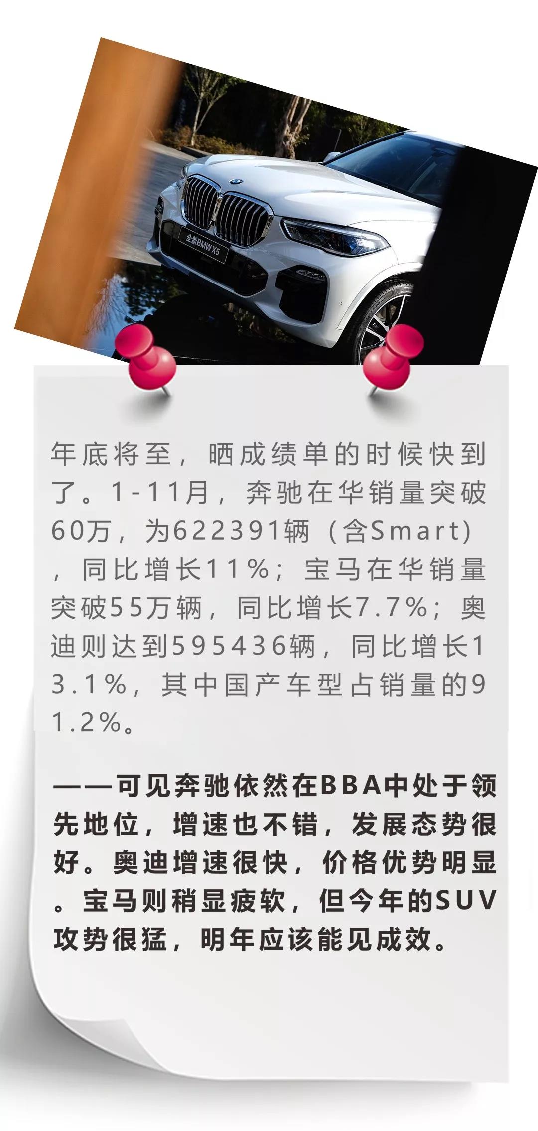 1-11月销量出炉,作为豪华品牌三巨头的BBA到底哪家拔得头筹呢?说到BBA,宝马刚上市了全新X5,结束了2018 X之年。奔驰将于下个月,也就是2019年一月发布全新奔驰CLA级。奥迪则将于明年在中国市场推出13款新车,奥迪e-tron也将衍生入门版车型和高性能版车型。目前新能源大火,美日两家企业联合共同推进石墨烯-硅锂离子电池的商业化;宁德时代也在美国成立了自己的第四个海外子公司;采埃孚则投资8亿欧元推进电动变速箱生产,以期转型;江淮大众研发中心正式开建,为思雅特和大众在中国的新能源之路充能。最后还是来看一款新车消息,告别“眯眯眼”的新款JEEP自由光上市,动力改变是车灯变化之外的另一大亮点。注:图片均源于网络,请作者联系我们,以奉稿酬