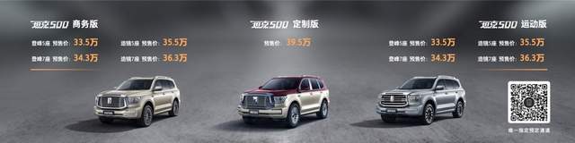 11月19日,坦克500在广州车展正式开启全国预售,共推出商务版、运动版及定制版三个版本,同时提供5座、7座车型可选,预售价格为33.5万元-39.5万元。同时,与用户共创的坦克500黑武士版本同步开启预售,预售期限量发售500台,预售价格为36.5万元。针对预售订购用户,坦克品牌还推出了惊喜4重礼,以及6项限量福利政策。