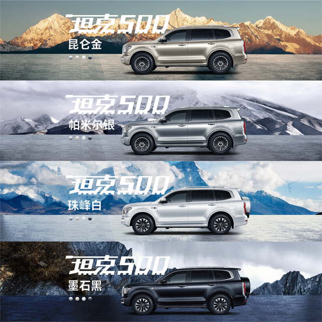 本次坦克500推出昆仑金、帕米尔银、珠峰白、墨石黑四款外观颜色,以及双棕、蓝米、黑色三种内饰配色;定位中大型豪华越野SUV,坦克500以兼容品质越野和商务豪华的强大产品实力,迅速引燃本届广州车展的观展热情,火爆势头持续霸屏各大平台。