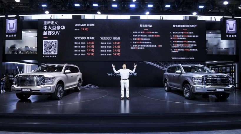 “坦克,铁汉柔情”全球发布会火热开启,坦克500正式开启全国预售,共推出商务版、运动版及定制版三个版本,预售价格为33.5万元-39.5万元。同时,与用户共创的坦克500黑武士版本同步开启预售,预售期限量发售500台,预售价格为36.5万元。