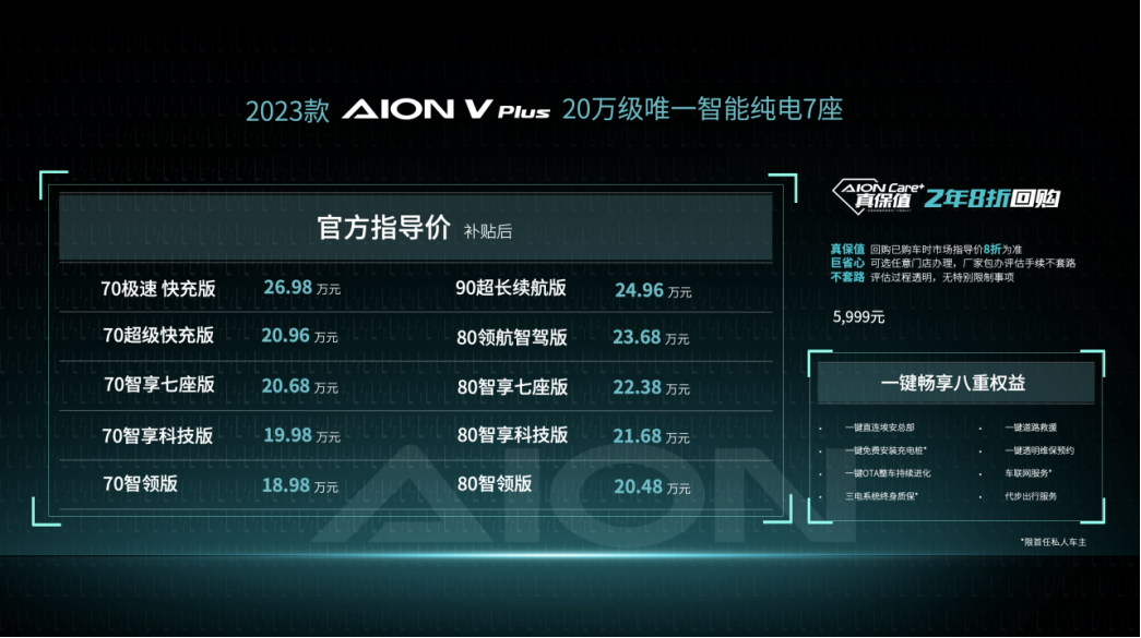 2023款AION V Plus的神7上市,以开创20万级纯电7座新蓝海与持续突破的科技创新,再一次体现出埃安品牌在新能源领域的创新能力。经过4年多的努力奋进,埃安品牌呈现出发展速度快、发展质量高的“埃安现象”,已逐渐占据了新能源汽车市场的头部地位,进一步夯实“世界级新能源领军品牌”的地位。2023款AION V Plus作为“20万唯一智能纯电7座”与品牌的“科技担当”,将成为更多都市精英家庭“更聪明的陪伴”,为用户带来更多“先人一步的科技享受”。