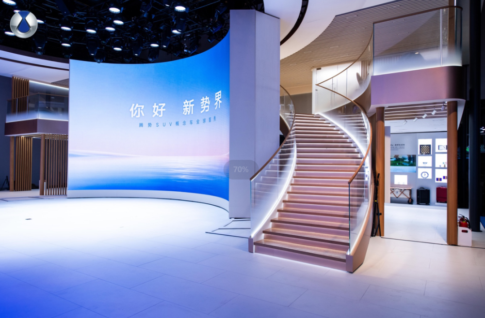 作为品牌焕新后首次参加的国际A级车展,腾势以双层独立展台,全面展示了“智慧、安全、新豪华”的全新品牌形象。展台整体空间设计采用核心筒的建筑结构,将腾势LOGO的“兼容并蓄”“对自然、可持续性的拥抱”的精神理念灌注其中;大面积木纹材质、弧形元素的应用,让空间视觉给人带来更舒适的感受。