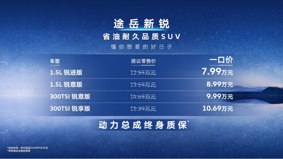 从途观L Pro到途岳新锐,上汽大众SUV战略布局强势发力,进一步表明上汽大众继续领跑燃油车领域、坚定实行“油电同进”的决心。一口价7.99万起、动力总成终身质保、省油耐久的越级实力,途岳新锐将以A级SUV市场新标杆之姿,为用户提供一步到位的用车体验,给予用户“天长地久”的陪伴和守护。