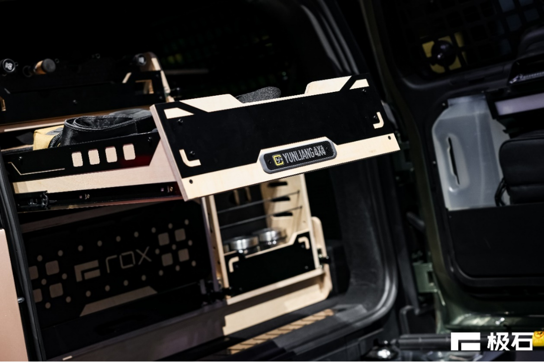 钓鱼大师版改装套件由极石汽车携手国内越野改装专家——运良越野共创,采用"Camping Loft"设计理念,由车顶帐、侧边天幕、尾门厨房系统、淋浴帐及加压水箱、魔盒套件组成。业界首创的钓鱼魔盒套件以露营IGT模块为灵感,拥有多达12处收纳空间,能够合理存放鱼竿、鱼轮、鱼饵、鱼线等各类渔具,结合专属的车顶帐、L型侧边天幕、尾门厨房系统等拓展套件,创造出一个灵活百变的户外钓鱼工作站,解锁“极石出发,因渔而生”的渔趣体验。
