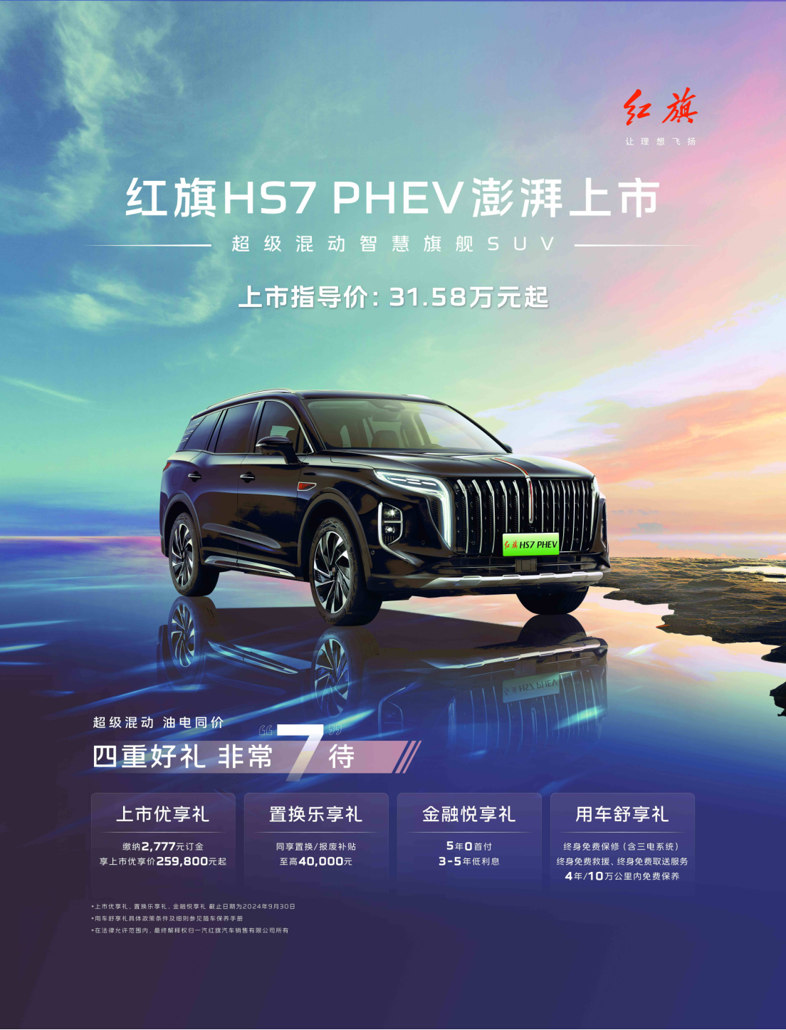 8月30日,超级混动智慧旗舰SUV 红旗HS7 PHEV在2024成都车展正式发布,官方指导价为31.58万元起。即日起,消费者购车尊享四重好礼,上市优享价25.98万元起。