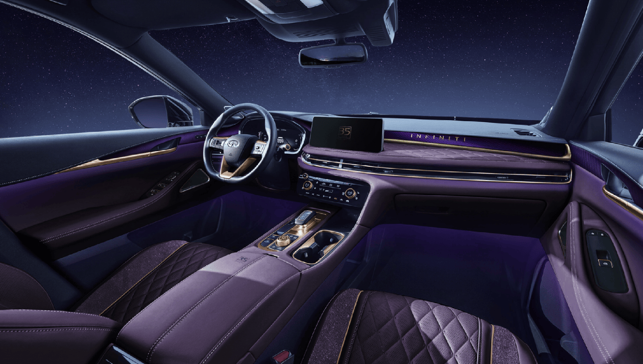 QX60共创概念版汲取品牌东方美学设计基因,并融入全新的 Artistry in Motion设计语言进化而生。“紫韵流金”车色,灵感来自难得一见的自然霞光,以深邃的魅影紫为基调,以华丽的玫瑰金点缀细节,绽放无限魅力;搭配竹海律动格栅、“暗夜魅影”空气扰流套件、无限之路轮毂,成就风格独具的艺术力作。