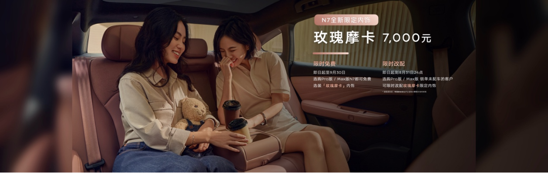 对于购买Pro版和Max版的N7用户,均可限时免费选装价值7000元的玫瑰摩卡内饰。不仅新用户,对老用户也考虑周到,对于已锁单且未配车的用户(Pro版/Max版)均可参与限时改配。不仅如此,备受消费者喜爱的副驾AI零压云毯座椅继续免费赠送。